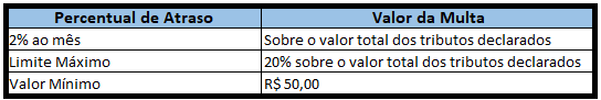 A multa por atraso na entrega da DASN-SIMEI é calculada em 2% ao mês sobre o valor dos tributos devidos, com um limite máximo de 20%. Se o cálculo resultar em um valor menor que R$ 50,00, a multa mínima será de R$ 50,00. Essa multa é aplicada automaticamente assim que a declaração é transmitida fora do prazo.