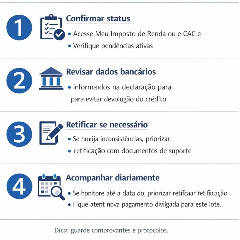 Confirme seu status no **Meu Imposto de Renda** ou no e‑CAC e verifique se há pendências ativas. Revise os **dados bancários** informados na declaração para evitar devolução do crédito. Se houver inconsistências, priorize a **retificação** com documentos de suporte e acompanhe diariamente até a data de pagamento divulgada para este lote.